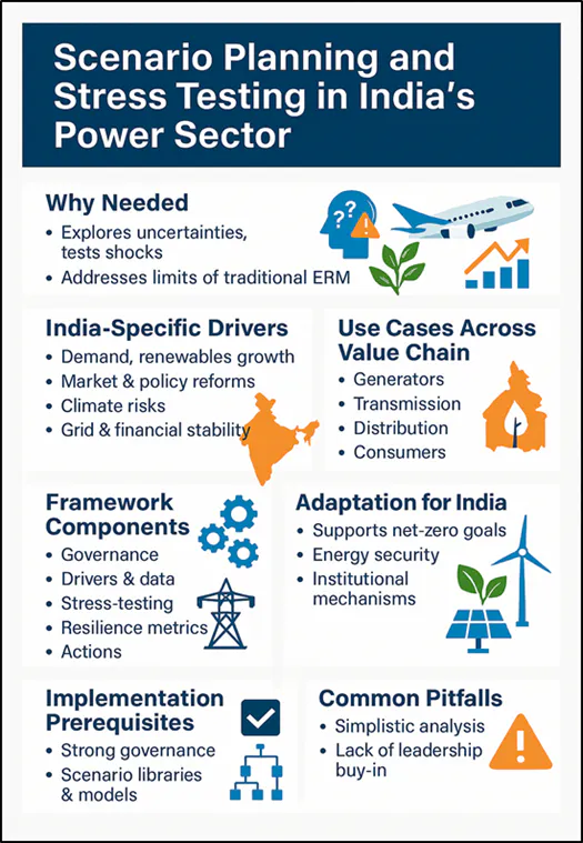 Scenario planning and stress testing represent a critical evolution in risk management for the Indian power sector. Unlike traditional methods, these approaches explicitly model how risks interact and amplify one another. Scenario planning enables utilities to explore multiple plausible futures, such as demand growth, accelerated RE adoption and market reforms, while stress testing focuses on extreme but plausible shocks, including climate change, fuel supply, grid constraints, cash flows and cyberattacks. Together, they provide a forward-looking, resilience-oriented framework that moves beyond probability-based thinking to preparedness for systemic disruptions with comprehensive data-driven strategies. Central to the framework is the development of a focused scenario library, which evaluates scenarios that impact operational performance (e.g. reliability indices, grid stability), financial resilience (e.g., liquidity, debt servicing) and regulatory compliances. Resilience scorecards, trigger thresholds and predefined management actions ensure that scenario insights directly inform capital allocation, fuel strategies, contingency planning, supply chain issues and regulatory engagement. Importantly, the framework must integrate with the core processes such as resource adequacy planning, budgeting and investments, thereby avoiding the common pitfall of treating scenario analysis as a standalone exercise.