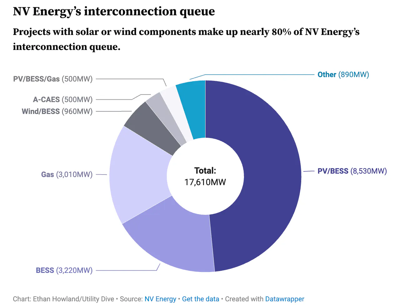 Nearly 80% of NV Energy’s 49 queued projects are solar or wind, many now at risk after 1) President Donald Trump’s tax credit rollbacks and 2) a DOI memo requiring top-level review of BLM land projects (which account for 67% of Nevada’s territory).