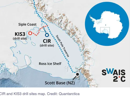 Phys.org: “Record-breaking Antarctic drill reveals 23 million years of climate history.” They were not collecting ice cores this time, rather sub-ice sediment cores. A team of 29 scientists, drillers, engineers and polar specialists living in tents on the snow at Crary Ice Rise had to first use a hot-water drill to melt a hole through 523 m of ice, then lowered more than 1300 m of “riser” and “drill string” pipe down the hole. “To our knowledge, the longest sediment cores previously drilled under an ice sheet are less than 10 m,” said Molly Patterson, co-chief scientist and associate professor of earth sciences at Binghamton University. “We exceeded our target of 200 m, and undertook this 700 km from the nearest base—this is Antarctic frontier science.”