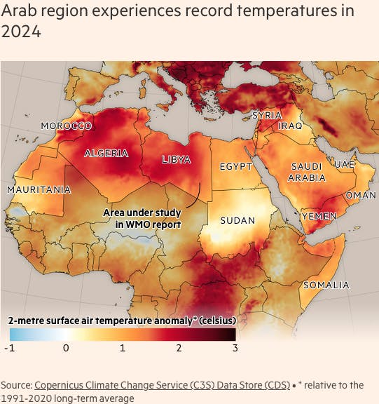 FinancialTimes: "‘Too hot to handle’: climate change pushing Arab region to limits, says WMO." An inaugural UN agencies report shows a stretch of 22 countries is warming at twice the global average. "The Arab region [is] being pushed to its limits by intense heatwaves and severe droughts." For 2024, 3.8 million people were affected, with more than 300 documented deaths, chiefly from heatwaves + floods, in the first such report compiled by the World Meteorlogical Organization, which included the League of Arab States. "The region covering 22 countries—stretching from the Arabian peninsula and the Levant to north Africa and Somalia in the south—experienced an average near-surface temperature rise of 1.08ºC above the 1991-2020 average and 1.94ºC above the 1961-1990 baseline.