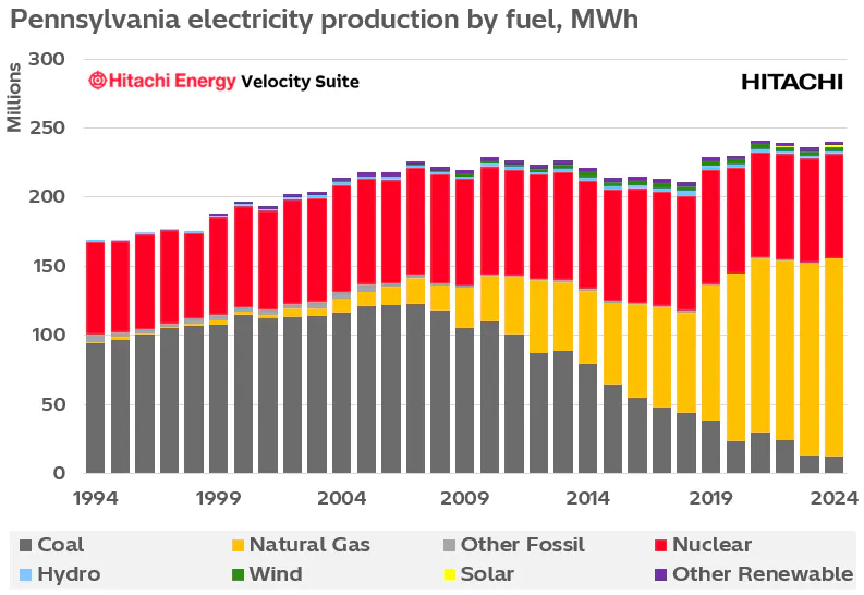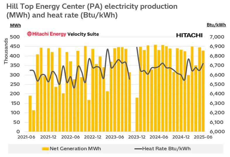 Last week, Blackstone announced that private equity funds affiliated with Blackstone Energy Transition Partners have entered into a definitive agreement to acquire the Hill Top Energy Center, a 620-megawatt combined-cycle natural gas power plant in Western Pennsylvania for nearly $1 billion (roughly $1,600/MW), from Ardian, a global private investment firm. Hill Top is one of the newest and most efficient combined-cycle natural gas plants in the country. According to data from Hitachi Energy’s Velocity Suite research team, since opening in July of 2021, the plant has generated more than 18 million megawatt hours (MWh) with an average, relatively low, heat rate of 6,650 Btu/kWh. The plant is in Greene County, PA, and participates in the PJM Interconnection power market. Today, natural gas accounts for about 60% of the electricity production in Pennsylvania – in 2005, the fuel represented only 5% of the state’s production. According to Blackstone, the Hill Top purchase is part of the company’s plan to invest more than $25 billion “to support the build out of Pennsylvania’s digital and energy infrastructure supporting the AI revolution and help catalyze an additional $60 billion investment into the Commonwealth.” Powering good!