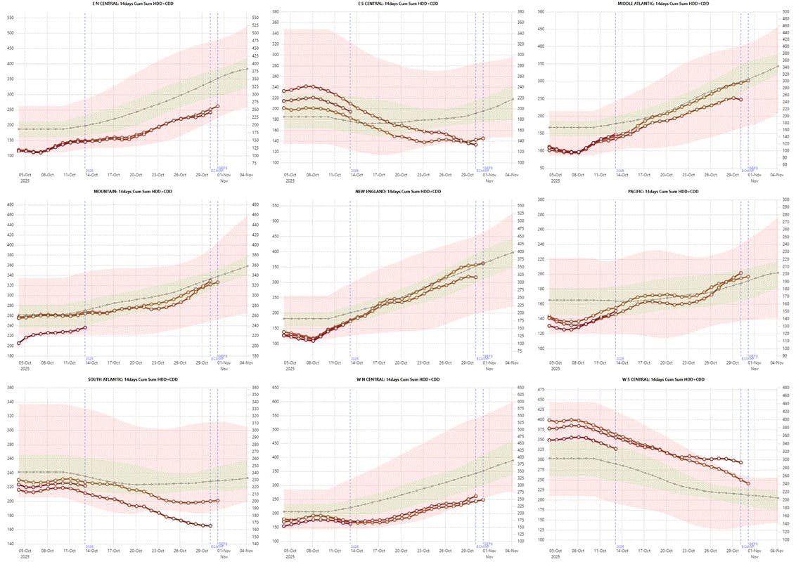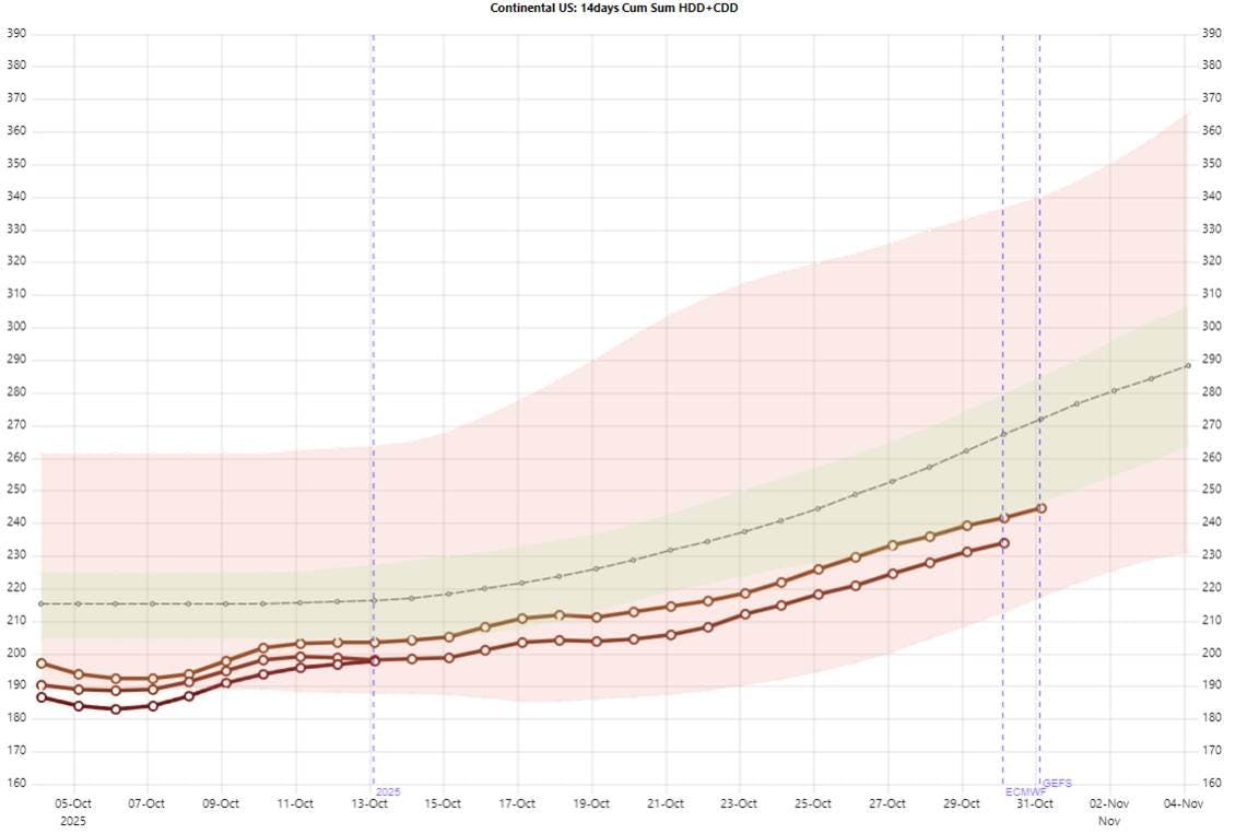 Conclusion: Cumulative HDD+CDD values over the past 14 days remain below the historical averages for all regions (1994โ2024 baseline). Even factoring in the two-week forward forecast, no significant deviation from the prevailing mild weather trend is expected โ a dynamic that continues to suppress weather-driven risk premiums across the curve.