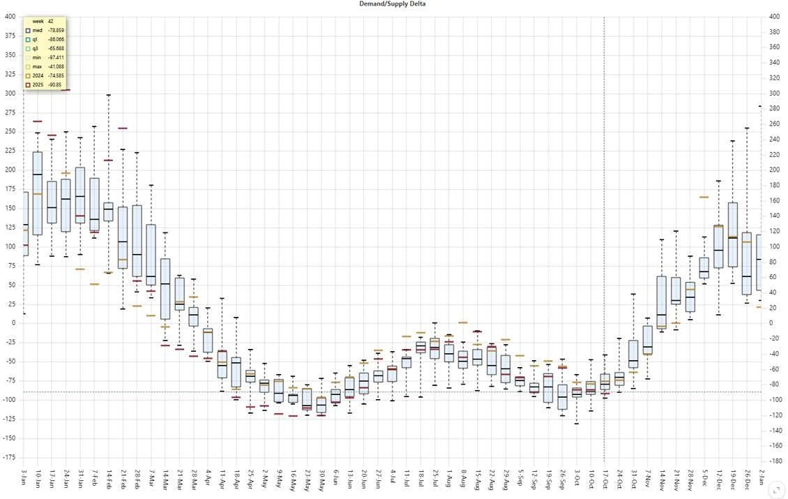 Conclusion: This week, the 2025 supply-demand differential is trending below the 2014โ2024 historical average, indicating either subdued demand or excess supply. This imbalance continues to exert downward pressure on front-month pricing and reinforces bearish sentiment across the near-term curve.