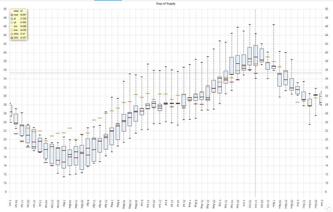 Conclusion: The chart illustrates the number of supply days covered exclusively by storage, based on current consumption rates. As of early October 2025, inventories equate to approximately 35 days of supply โ falling below the lower bound of the interquartile range. At this relatively modest inventory level, even minor disruptions in production or unexpected demand spikes could trigger sharp price reactions, particularly during late winter and early spring when market sensitivity peaks.