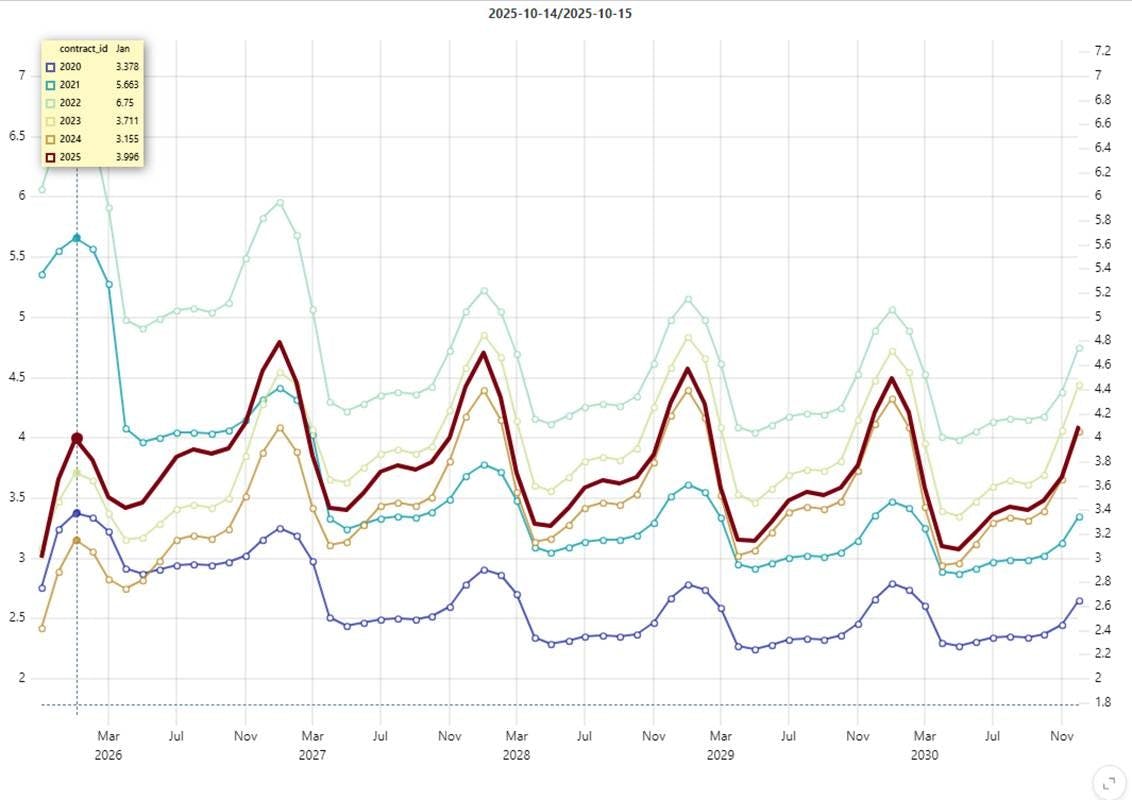 Conclusion: The forward curve shape in 2025 shows a consistent flattening trend, increasingly converging toward the configurations observed in 2023 and 2024 for comparable delivery dates. This pattern is particularly pronounced in longer-dated contracts โ those with maturities of three years or more โ where prices are steadily aligning with historical benchmarks.