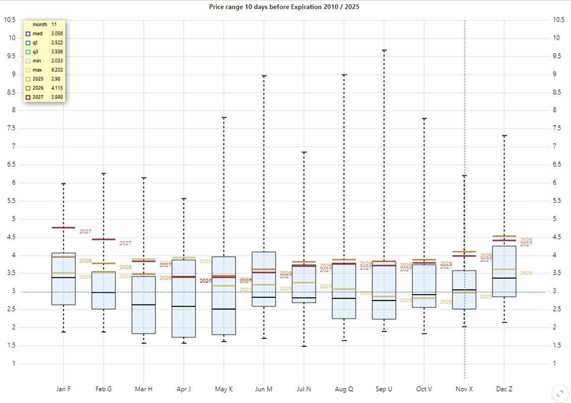 Conclusion: Due to mild weather conditions and elevated production levels, the NGX25 futures contract is trading below its 10-day pre-expiry average, exhibiting elevated volatility during this timeframe. Meanwhile, winter 2026 contracts remain priced above the upper bound of their interquartile range, signaling persistent bullish sentiment in the forward curve.