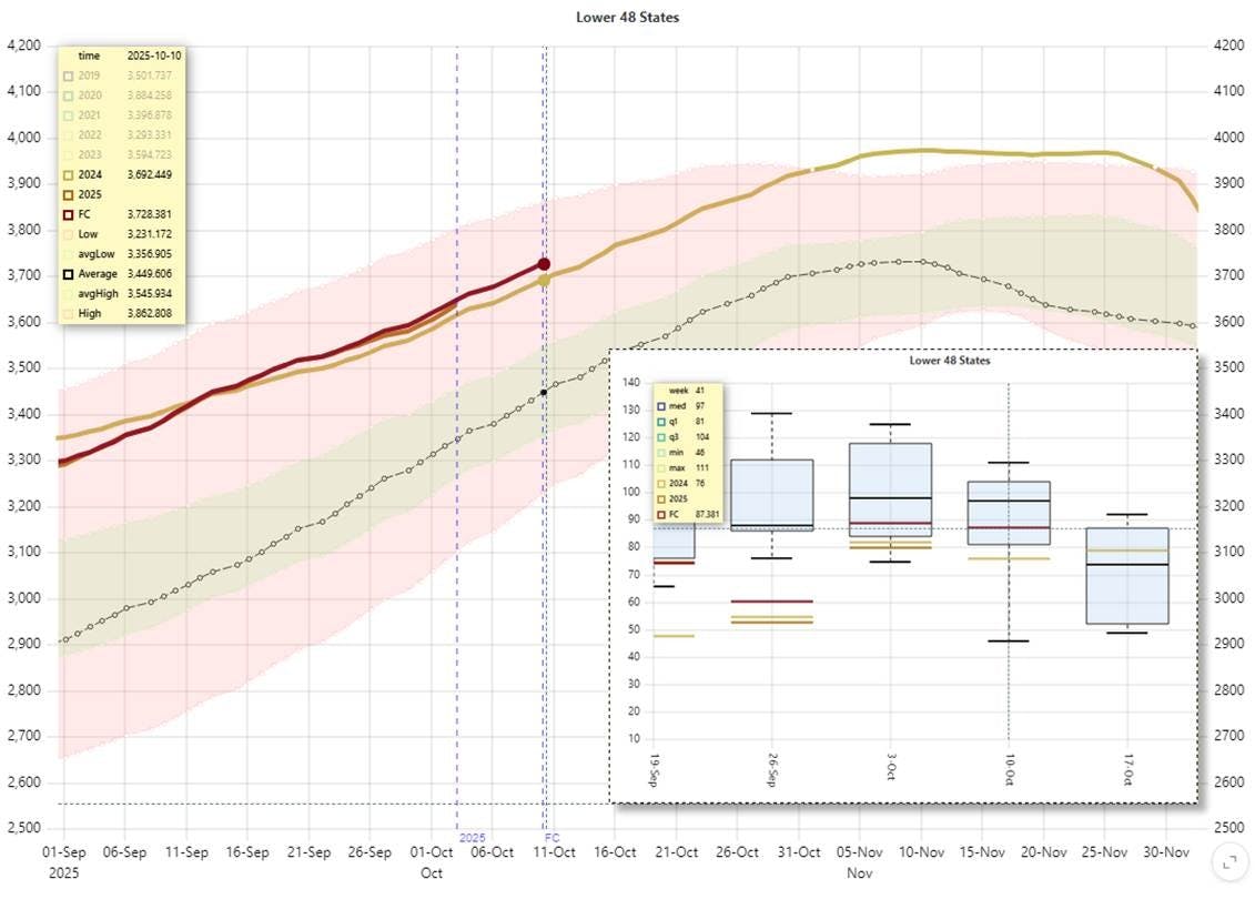 Conclusion: According to the Week 41 forecast (October 6โ12), underground gas storage levels are projected to increase by +87 BCF, reaching 3,728 BCF โ surpassing the inventory level recorded during the same period last year. The build is supported by robust production volumes and unseasonably mild weather conditions, both of which continue to weigh on near-term pricing and curve structure.