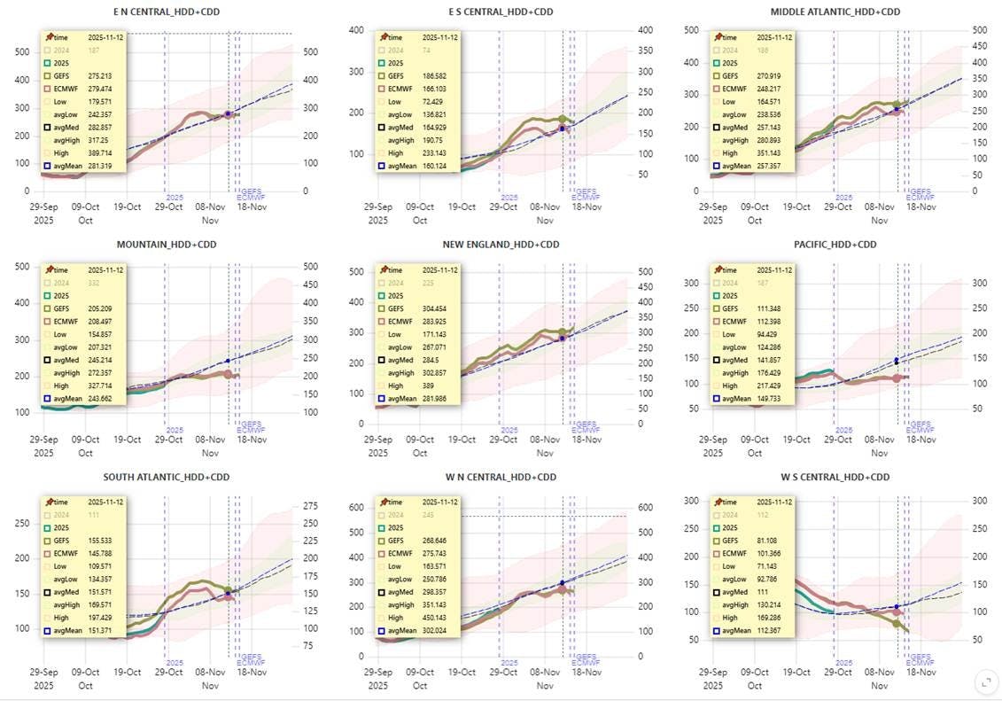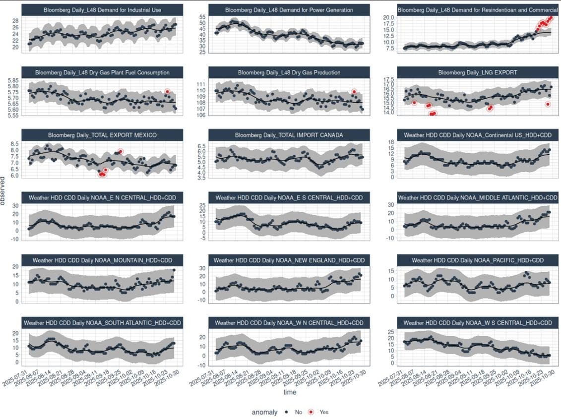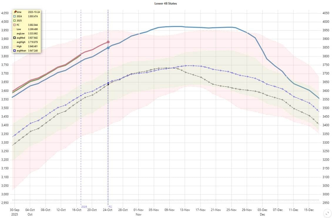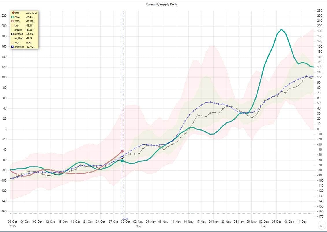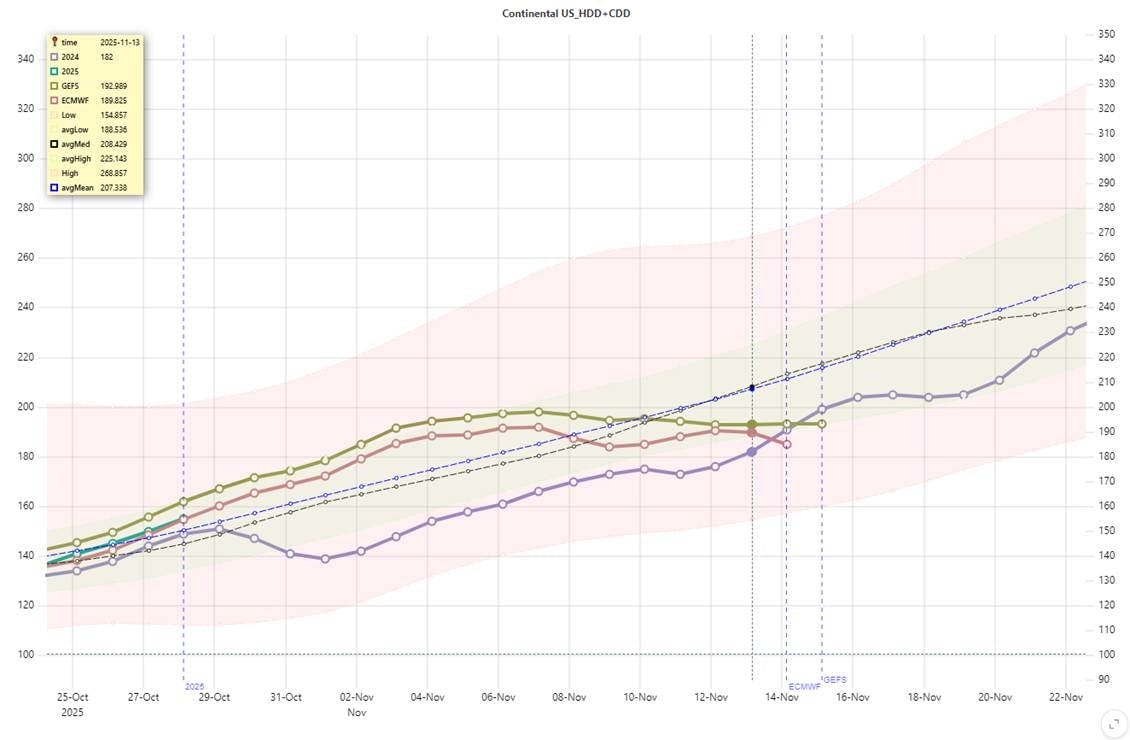 Conclusion: Overall, core fundamentals and weather-driven variables remain within seasonal norms. The exception is a continued uptick in residential and commercial demand, driven by the onset of the heating season. However, no significant cold anomalies have been observed during the early phase of this transition.