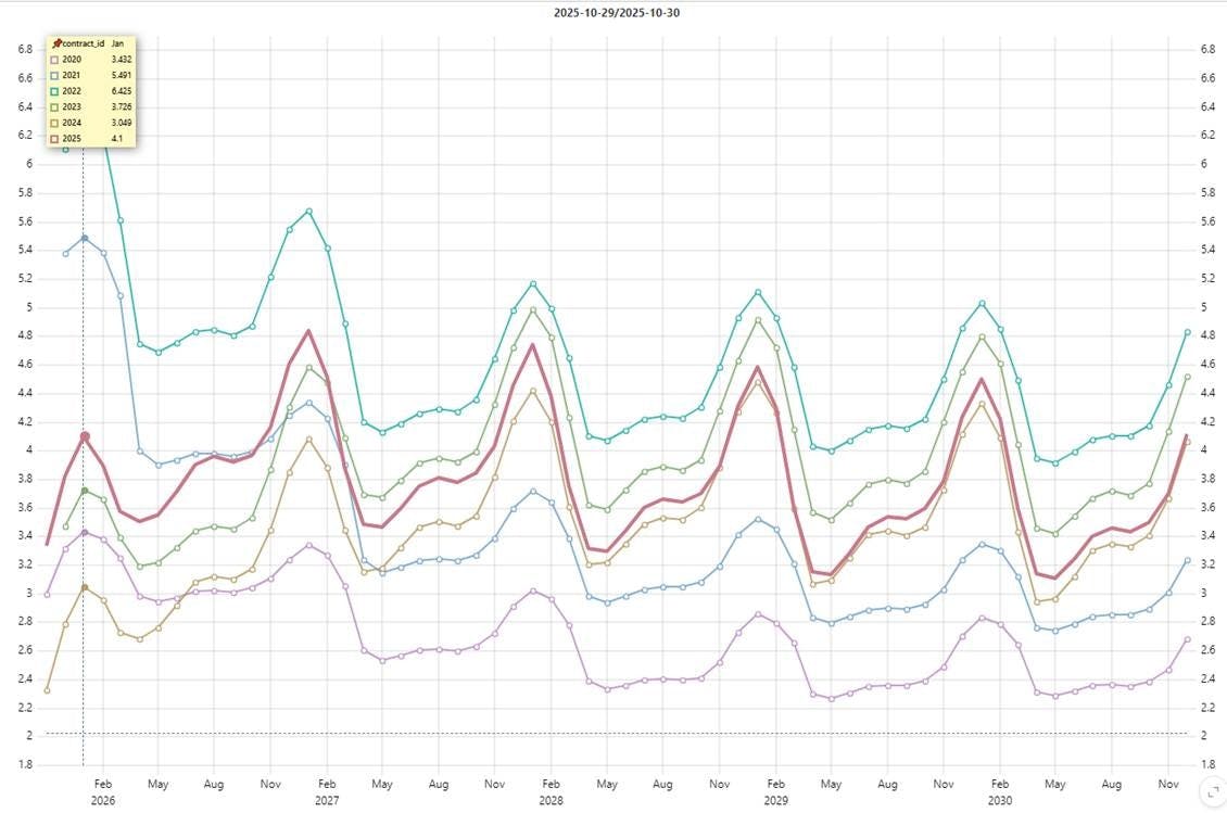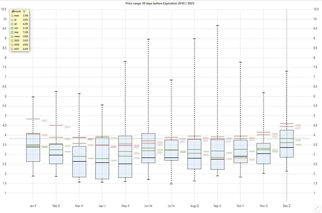 Conclusion: The expiration of the NGX25 contract settled above the historical median based on data since 2010. December and winter 2026 natural gas futures continue to trade with upward momentum, holding above the upper bound of the interquartile range.