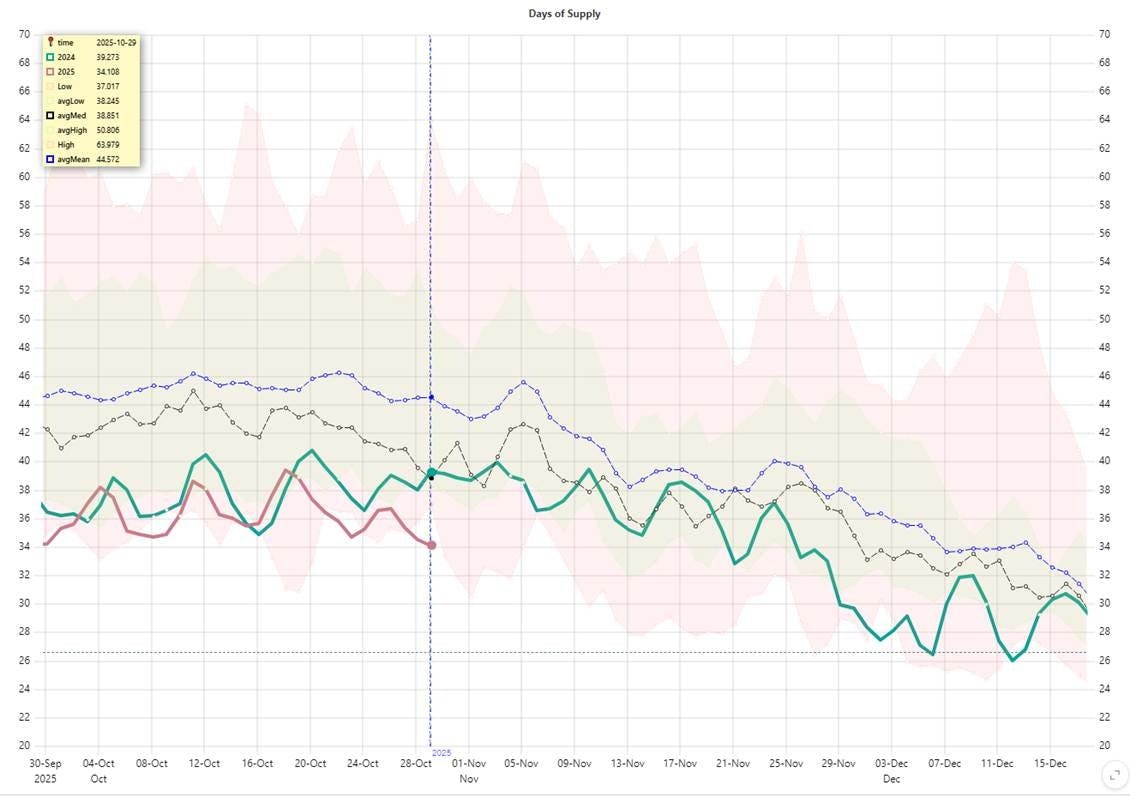 Conclusion: The above chart illustrates the number of supply days covered exclusively by underground storage, based on current consumption rates. As of late October 2025, inventories are sufficient for approximately 34 days โ below the lower bound of the historical interquartile range. At this moderately reduced storage level, even minor production disruptions or demand spikes could trigger sharp price responses, particularly during late winter and early spring.