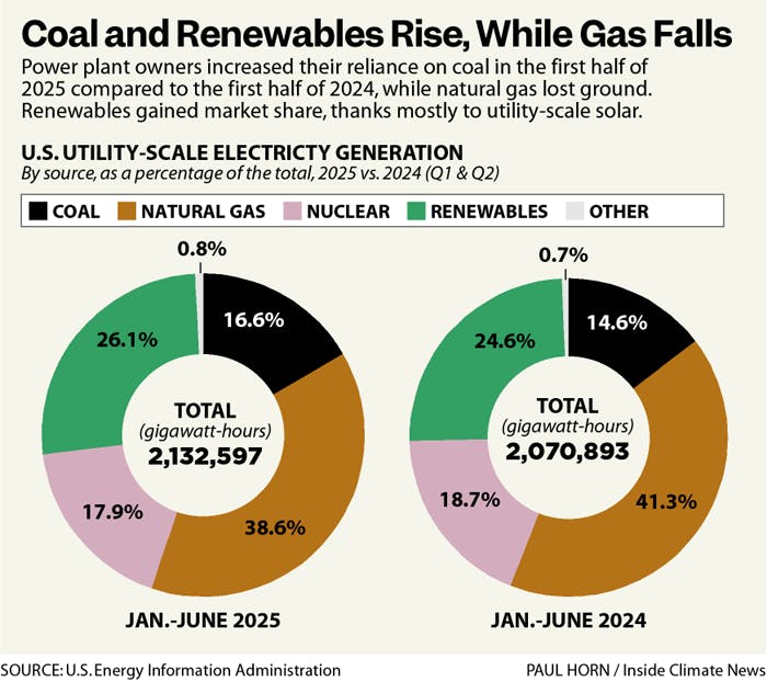 Coal and solar both grabbed bigger slices of the US power mix in the first half of 2025 while natural gas slipped, new EIA data shows. (Inside Climate News)