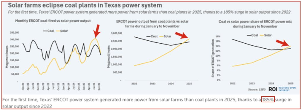 Reuters: “Texas makes clean power breakthrough as solar output overtakes coal.” In 2025, Texas’ main power system looks set to have generated more power from solar farms than coal plants during a calendar year, marking a key new energy milestone for the largest [purposely isolated] power network in the U.S. “The Electric Reliability Council of Texas (ERCOT) generated 2.64 million megawatt hours (MWh) of power from solar assets, compared with 2.44 million MWh of power from coal plants for the January-to-November period, according to data compiled by the London Stock Exchange Group [LSEG].”