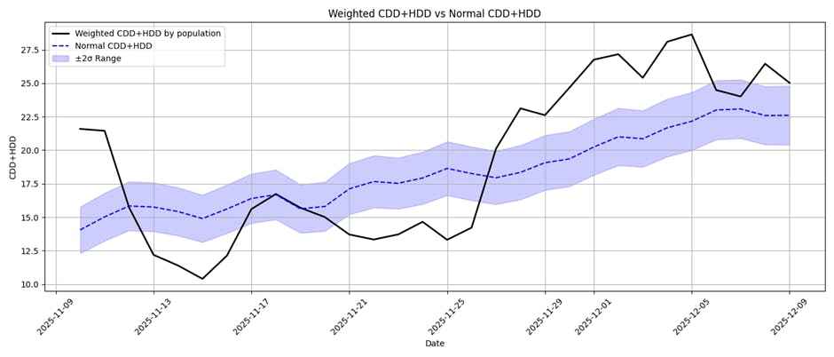 Compared with climatological normals, weighted U.S. CDD+HDD values tracked mostly above the expected seasonal range, particularly toward the end of the period when actual values climbed toward the upper portion of the normal envelope. While readings generally remained within the ±2σ band, the steady rise in degree days over the past several days highlights a strengthening cold signal across the core demand regions. The relationship between actual and normal values indicates a transition into a more winter-leaning regime, with fewer interruptions from milder interludes.