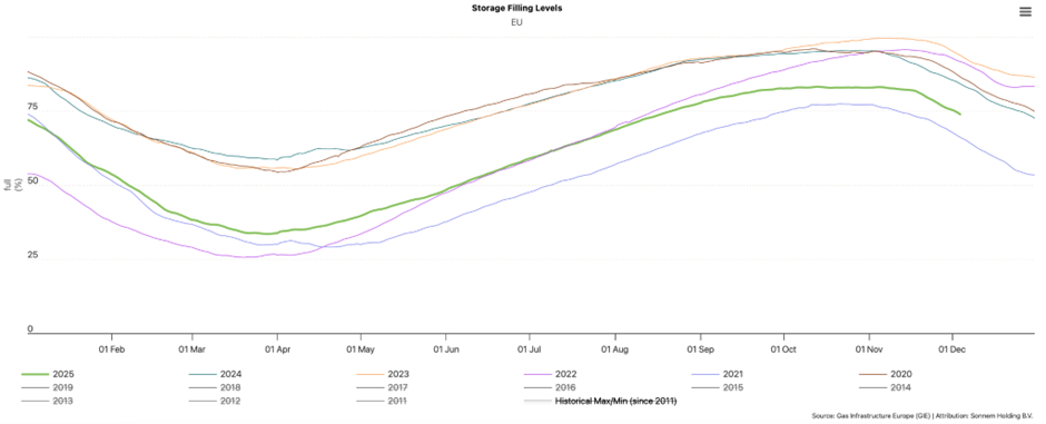 As of early December 2025, European gas storage levels stand near 74% full, placing them below the exceptionally strong refill years of 2020, 2022, 2023, and 2024, but clearly above the weaker levels observed in 2021. The 2025 trajectory occupies a mid-range position relative to the recent historical curves shown, reflecting a refill season that was solid but not among the strongest of the past several years. Refill progress through summer and autumn was steady, with no early plateauing, and storage peaks were reached in line with recent seasonal patterns before the onset of withdrawals. Overall, the current level of inventories indicates that Europe enters the winter with a comfortable buffer capable of absorbing early cold events and short-term demand fluctuations.