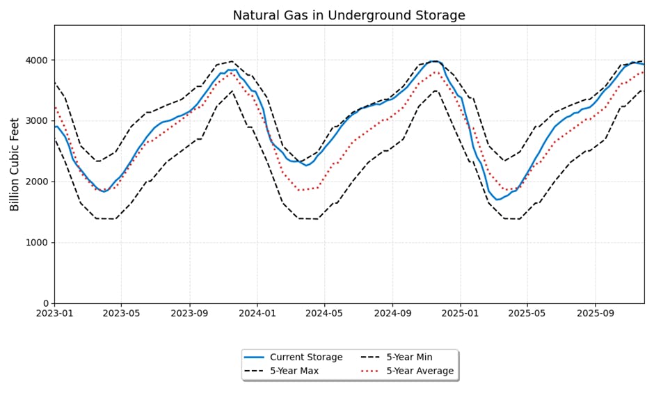 According to the EIA, as of November 28, 2025, U.S. working natural gas in underground storage stood at 3,923 Bcf. This represents a net weekly withdrawal of 12 Bcf compared with 3,935 Bcf in the prior week. Inventories are 18 Bcf lower than last year at this time and stand 191 Bcf above the five-year average, highlighting a storage position comfortably above seasonal benchmarks heading into early winter.