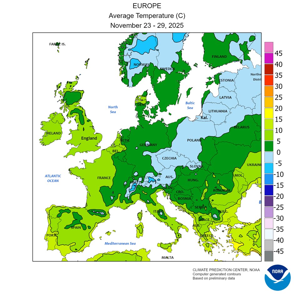 Across Europe, average temperatures during November 23–29, 2025, showed a clear division between the cooler northern and eastern regions and the comparatively milder western and southern ones. Scandinavia, the Baltic states, Belarus, and parts of Ukraine registered some of the lowest averages on the continent, consistent with ongoing Arctic intrusions and widespread early-winter chill across these areas. Central Europe, including Germany, Poland, and the Czech Republic, experienced intermediate but still seasonally cool conditions aligned with the broader negative anomalies reported for the region.