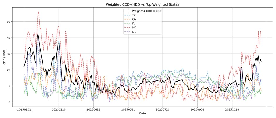 Among key states, New York recorded some of the highest totals, with sustained readings above 40 degree days late in the week as strong cold anomalies settled over the Northeast. Texas and Louisiana registered more moderate values in the teens and low twenties, reflecting early but not yet peak heating requirements. Florida remained at the bottom of the range with single-digit to low-teens readings, consistent with limited cooling demand and only minimal heating load. California also stayed on the lower end, with teens and low-20s degree-day totals aligned with its seasonally mild conditions.
