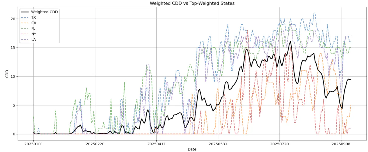 Looking ahead to September 11–16, forecasts point to a continuation of this split pattern. The Plains and Mississippi Valley will likely stay warmer than normal, sustaining elevated CDD in Texas and Louisiana. Florida should also remain consistently hot, keeping cooling demand high. By contrast, the Northeast (New York) will stay cool, with minimal CDD, while California trends moderate with only slight residual cooling needs. This divergence means that U.S. natural gas demand for power generation will remain regionally concentrated in the South and Southeast, while overall national gas burn for cooling will gradually ease as autumn conditions deepen in the northern states. This shift toward lower weighted CDD marks the shoulder season transition, where storage injections dominate the market balance and weather-driven demand becomes less intense.