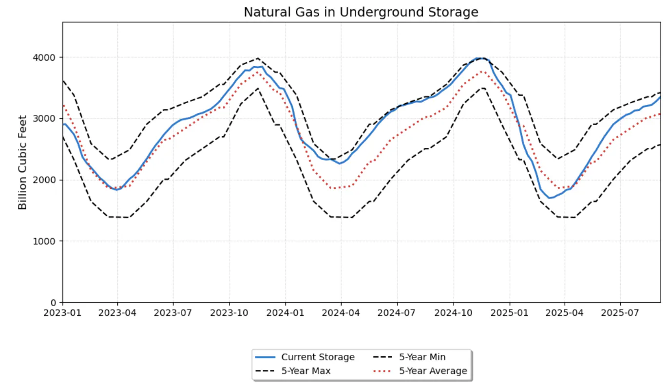 As of September 5, 2025, U.S. working gas in underground storage stood at 3,343 billion cubic feet (Bcf), according to the EIA. This marks a weekly net injection of 71 Bcf, bringing inventories to a level that is 188 Bcf above the five-year average and comfortably within the five-year historical range. Compared with last year, storage is only 38 Bcf lower, showing that the U.S. has maintained healthy injection momentum despite strong LNG exports.