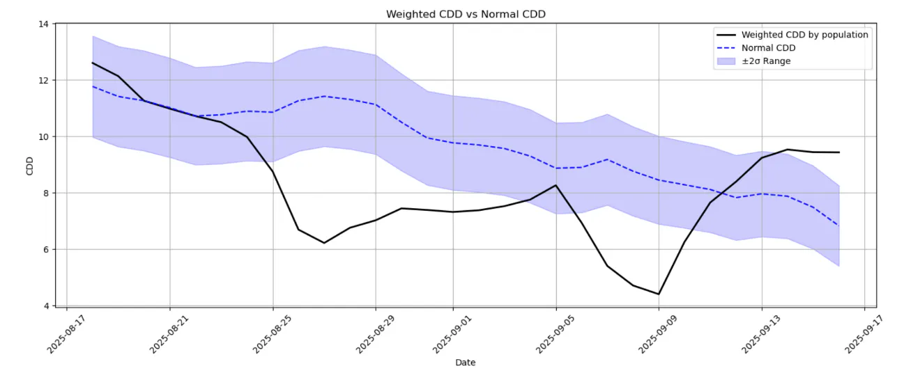 The past week brought unseasonably cool weather to much of the U.S. East and Midwest, with temperatures ~1–3°C below normal in central and eastern states. This early autumn cool-down sharply reduced air-conditioning demand in northern markets – for example, New York saw very low cooling degree indices, signaling virtually no need for AC. In contrast, parts of the South and West experienced late-season heat. Texas, in particular, faced a sudden heatwave, driving a spike in electricity use for air conditioning. This regional divergence means overall gas demand for power generation eased relative to peak summer, as cooler conditions in populous eastern areas offset higher AC usage in the South.