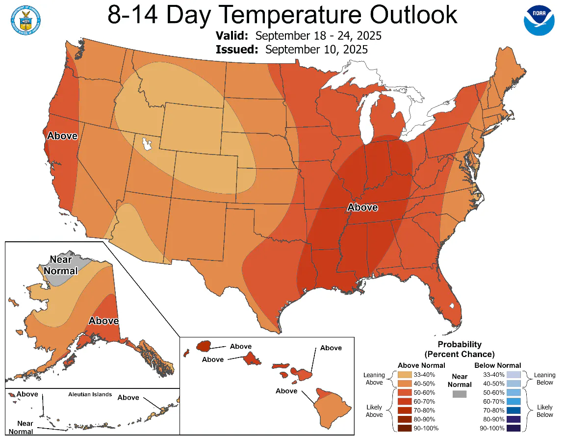 Looking ahead, warmer-than-normal conditions are expected to linger into mid/late September across much of the country. A stable high-pressure system over the Western U.S. is keeping Arctic air at bay and supporting above-average warmth in the central states. This extended warmth is delaying the typical seasonal rise in heating demand. Homes and businesses usually begin burning more gas for space heating around this time, but with mild weather projected, the start of the heating season is effectively pushed back. In practical terms, the U.S. gas market is in a shoulder period with neither heavy cooling nor heating needs nationwide – a factor that has tempered domestic gas consumption and limited upward pressure on prices.