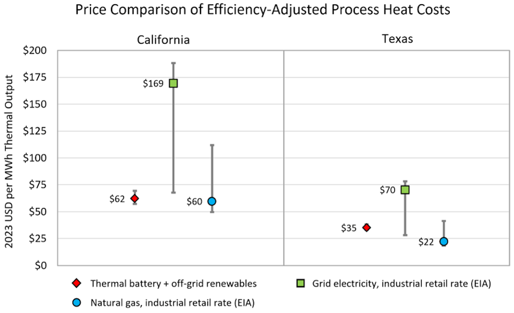 Accounting for thermal batteries’ capital and operational costs, they deliver heat at one half to one third the cost of using grid electricity directly, making them cost competitive with natural gas pricing.