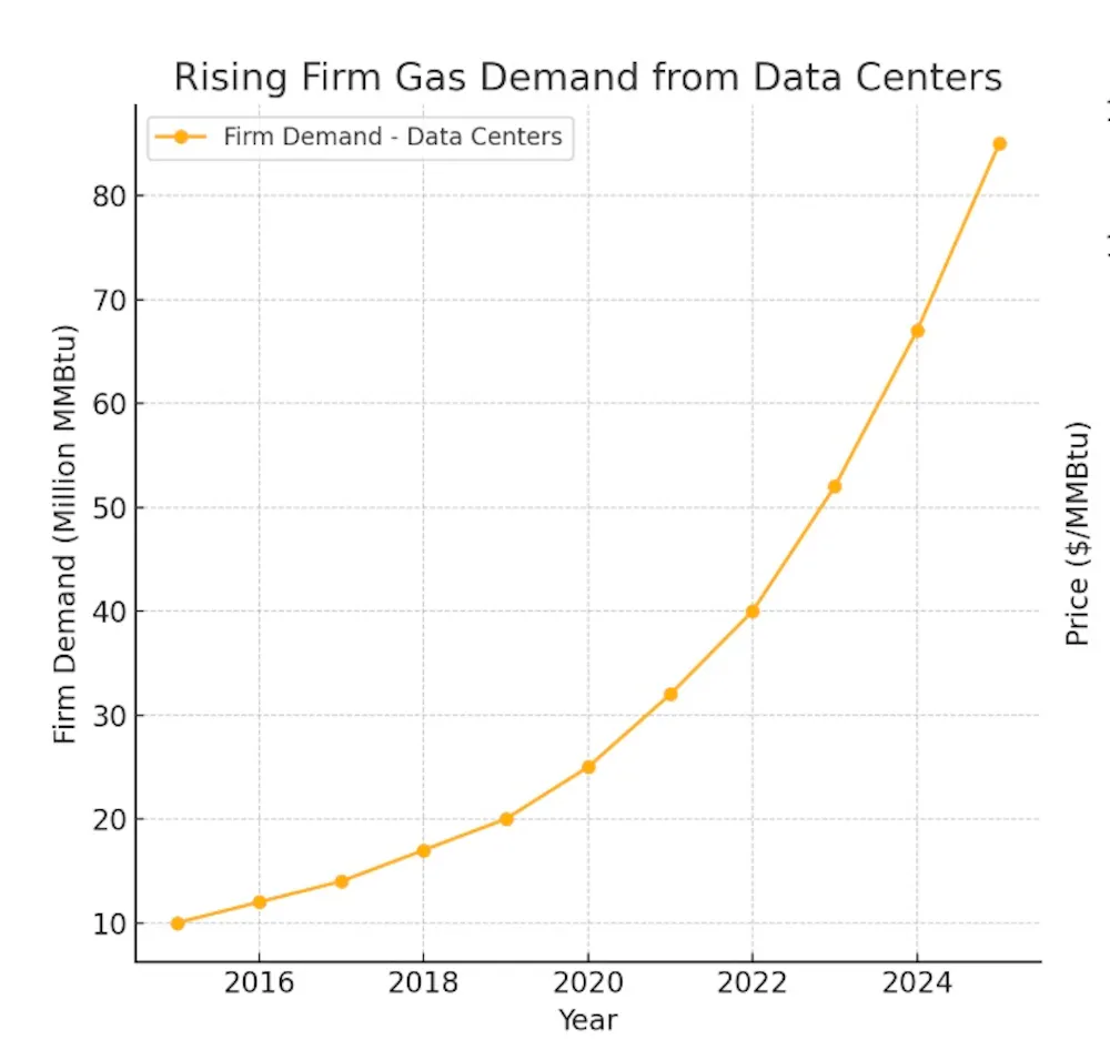 As AI adoption accelerates, firm gas demand from data centers has soared—from under 10 million MMBtu in 2015 to an estimated 85 million MMBtu by 2025.