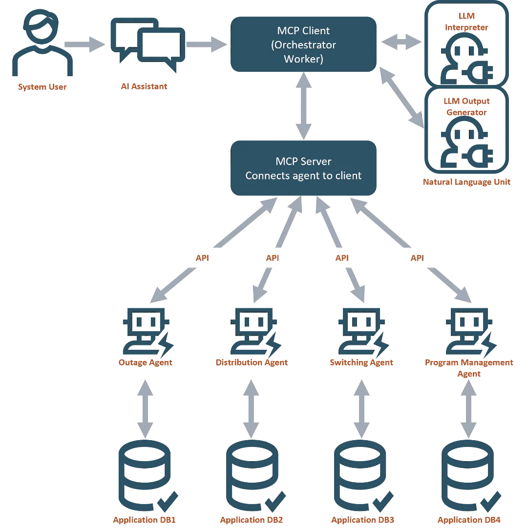 Vital components for a feasible solution in production include architecting a smart modern context protocol (MCP) client/server relationship for agent orchestration, LLMs to dissect user input, and resilient API design. The technical framework of how agents might interact with grid software products is shown below in Figure 2.