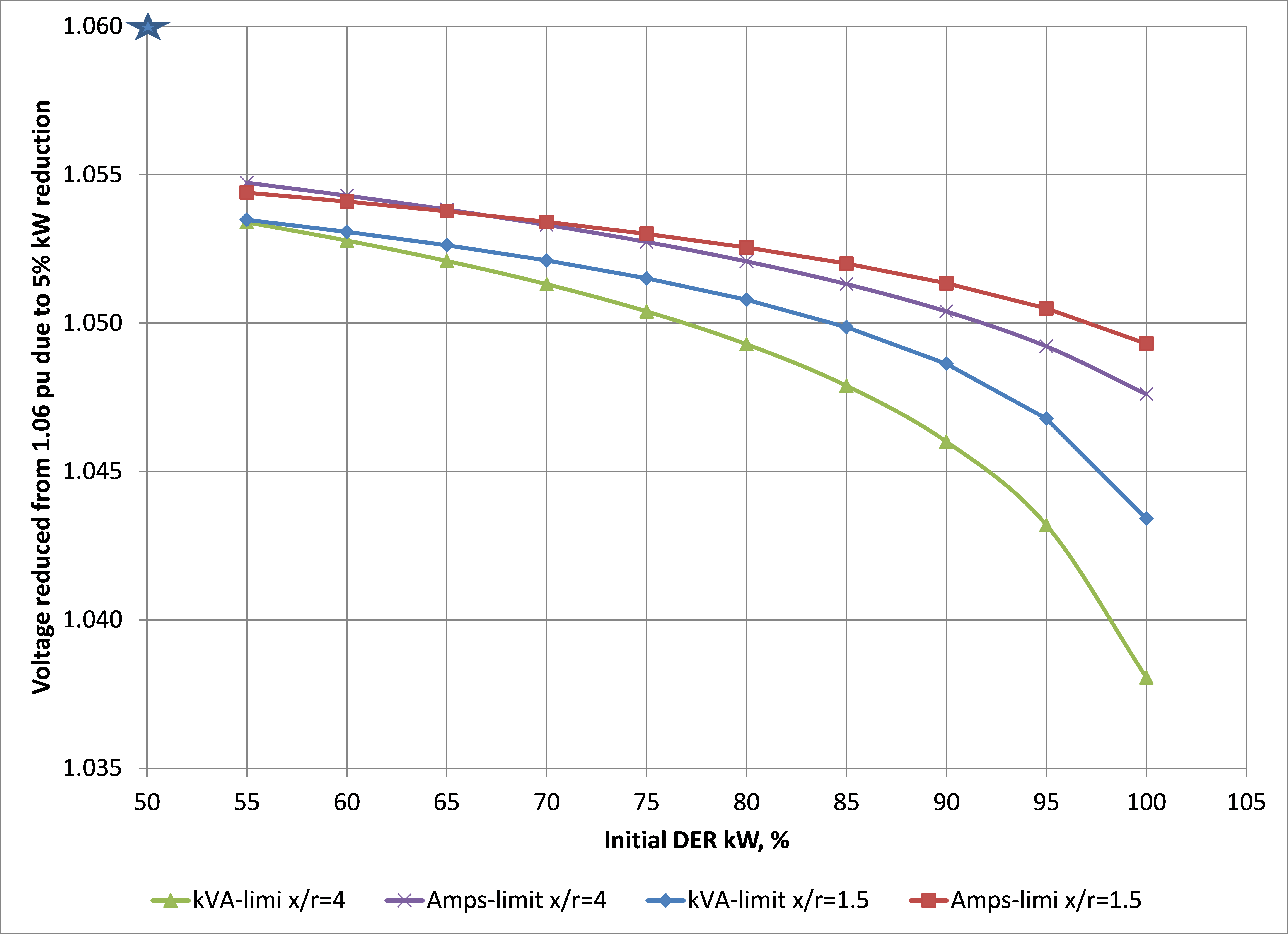 As seen in Figure 2 , the reduction of voltage by 0.01 is possible if the initial DER’s kW is above 75% in the case of kVA limit and is above 90% in the case of Amp limit (compare with 85% and 95% under x/r=1.5 respectively).