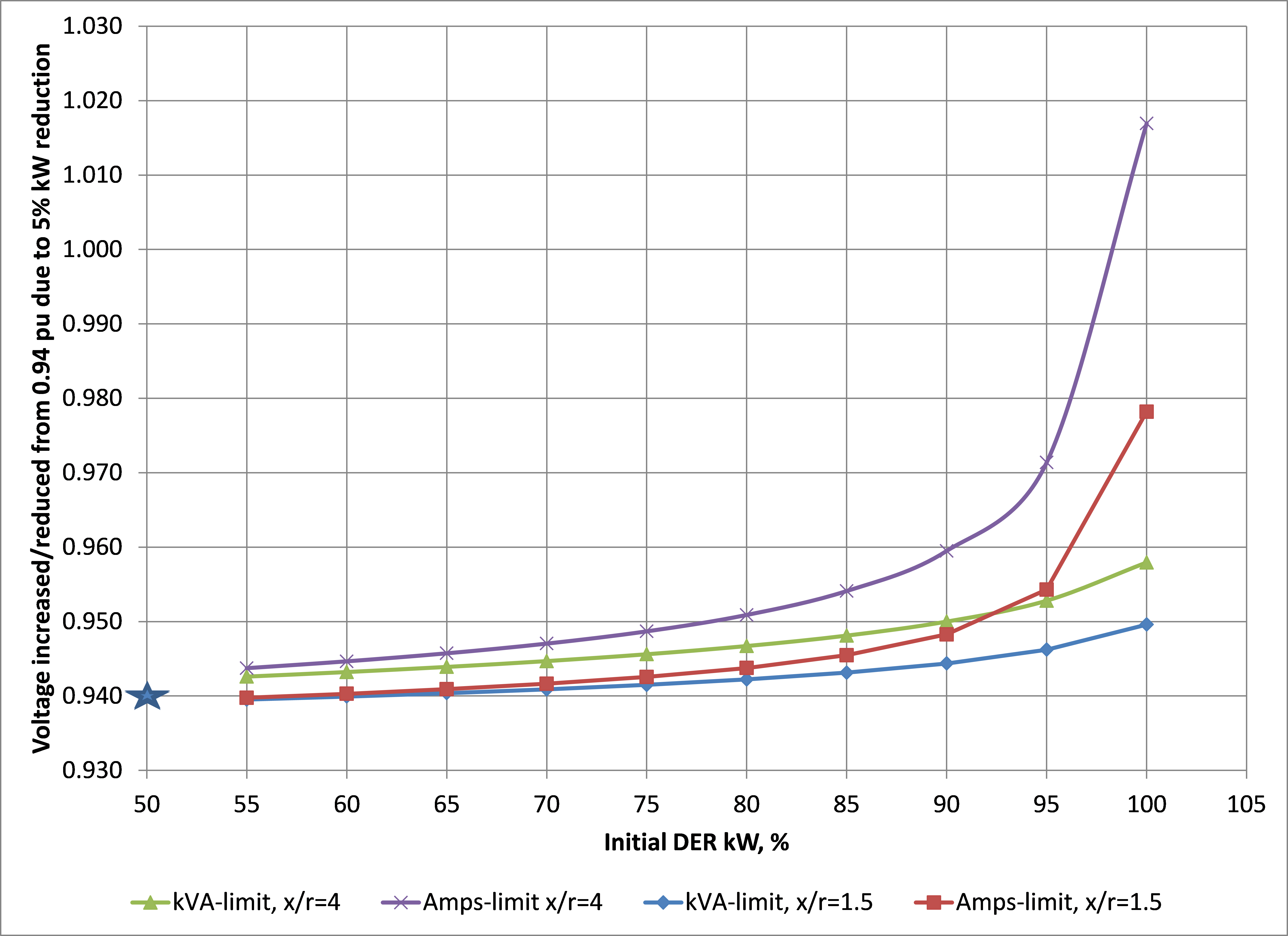 As seen in Figure 1, the increase of voltage by 0.01 in case of x/r = 4 is possible when the initial DER’s kW is above 90% in the case of the kVA limit, and is above 75% in the case of Amp limit (compare with 100% and 90% under x/r=1.5 respectively).