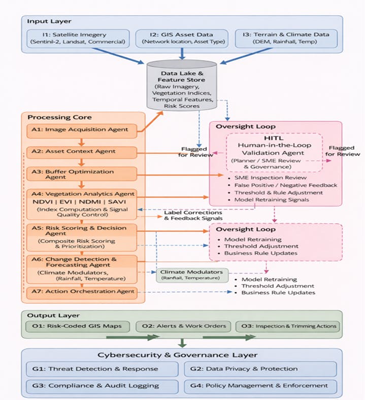 The proposed system architecture is organized as an agent-enabled workflow in which each stage of vegetation monitoring and risk management is supported by specialized AI agents. These agents collaborate across data ingestion, spatial analysis, temporal reasoning, and operational execution, transforming raw satellite observations into actionable maintenance decisions.