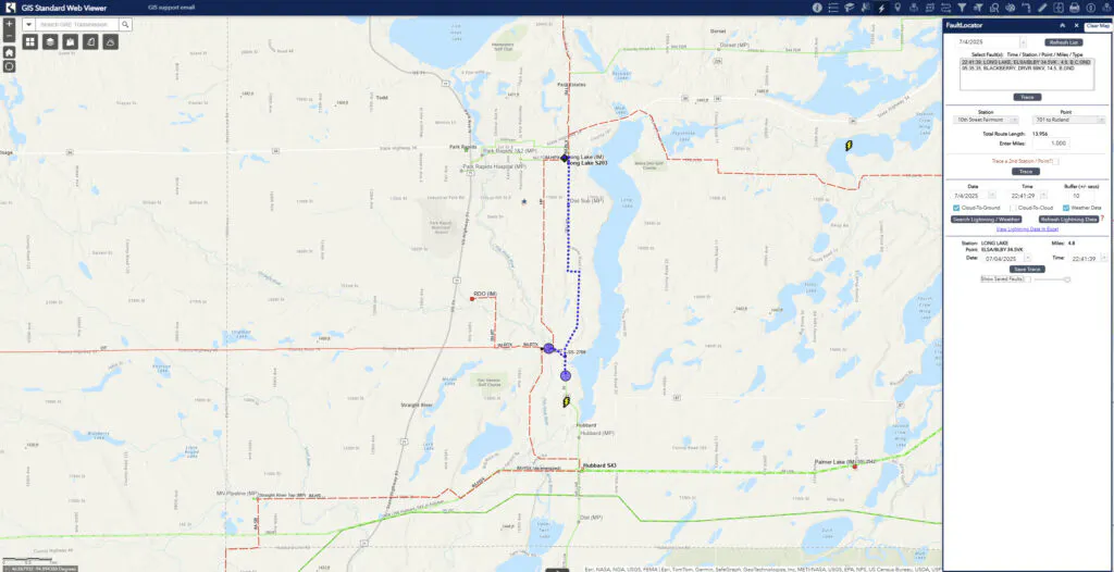 To address the inefficiencies of manual fault location, GRE implemented a GIS-based solution that automated the entire process. By leveraging linear referencing, also known as measured routes, the new system can accurately trace and display the fault locations on the transmission system based on the relay data. It also incorporates lightning strike data from the weather provider to help identify possible causes of momentary outages.