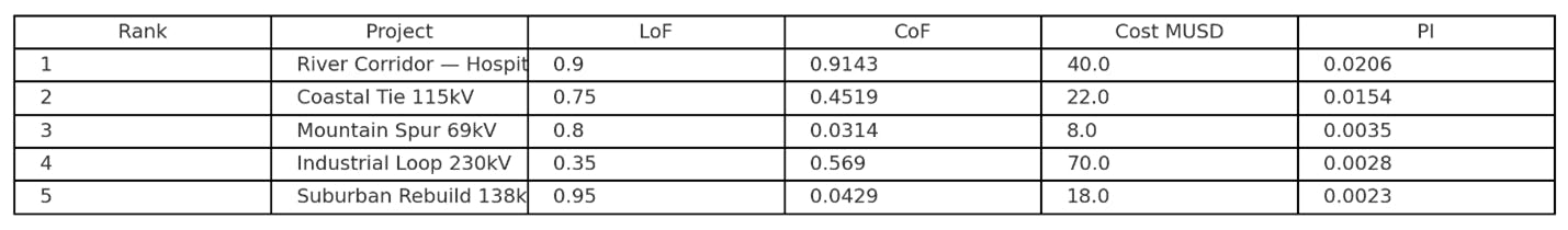 In practical terms, this means a line with high failure risk and high consequence but moderate cost will rise to the top of the list, while low-impact or high-cost projects move lower. This ranking gives asset managers a repeatable, data-driven framework for condition-based maintenance and capital planning, aligning spending with reliability and regulatory priorities.