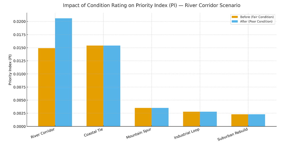 The condition-based scoring method shows significant downstream load, nontrivial critical counts, and high exposure. Likelihood rises because of age and condition, and consequence rises because of megawatts and criticality. Even with a higher price, the project moves near the top. The plan changes from “maybe next year” to “bundle adjacent spans and rebuild now,” and the reasoning is easy to see and defend under ISO 55001, the international certifiable requirements for asset management. This method clearly shows how rerating the River Corridor project from a fair to a poor condition boosts its priority index enough to push it above every other project, making it the clear top candidate even with a higher cost. Figures 2-4 show this data approach in action.