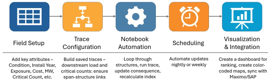 With these elements in place, build a notebook in ArcGIS Pro or ArcGIS Enterprise that loops through structures, runs the saved trace, records the downstream values, and updates consequence. Attribute rules then recalculate the priority index. Scheduling the notebook synch weekly or nightly keeps the scores current.