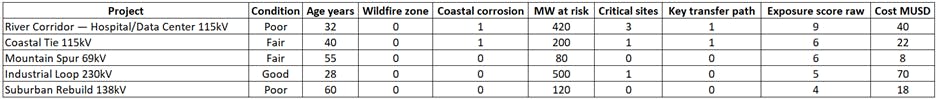 Consider a corridor that crosses a river and serves two hospitals and a data center. Structures show corrosion on inspection, and LiDAR found recent clearance issues. There is no practical alternative during peak season. An age-only method would bury this project in the middle of the list because it is not the oldest. A cost-only method would push it down because river work is expensive.Â