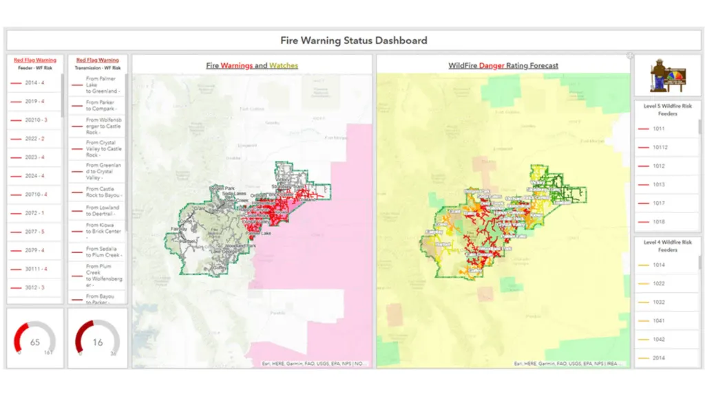 As a partner and recipient of Colorado's Fire Guard notification system and Wildfire Incident Management System, CORE presents warnings and system details with ArcGIS Dashboards and maps. As a result, situational awareness is raised across the organization. Users in the office and the field readily explore conditions in those areas on their displays. The transmission and distribution elements are color-coded based on risk and shown with the seven-day weather forecast.