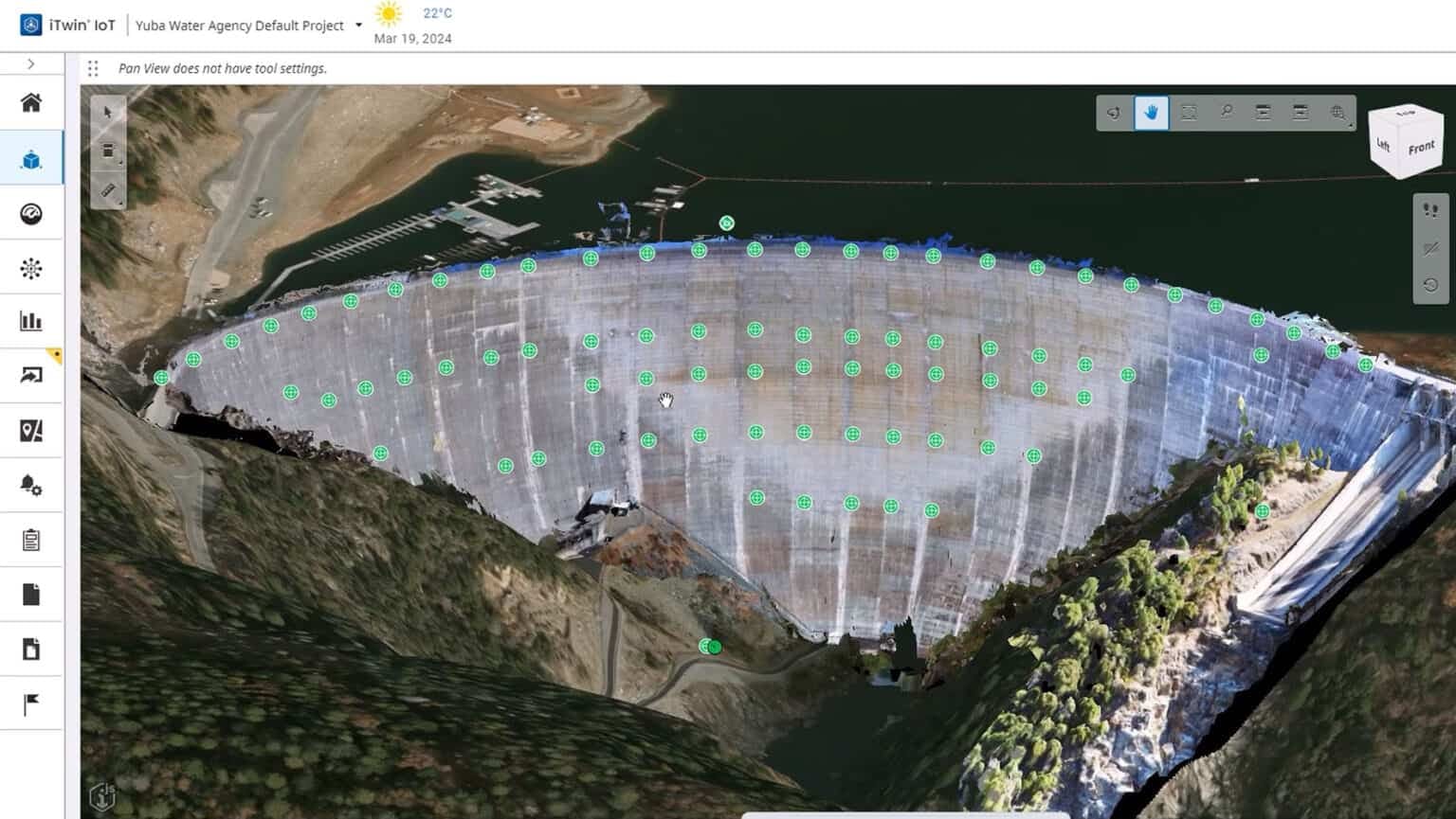 Committed to dam safety and top-notch infrastructure operations, Yuba Water Agency set off to revolutionize their monitoring system with a modern solution designed to remotely capture and visualize real-time data while automating alerts and reports of potential issues. They implemented a new monitoring system that is remotely operated and collects data from 83 Worldsensing sensors installed across the face of the dam. The sensor data is transmitted back to Bentley’s cloud-based iTwin IoT platform and is incorporated into a 3D digital twin model of the dam.