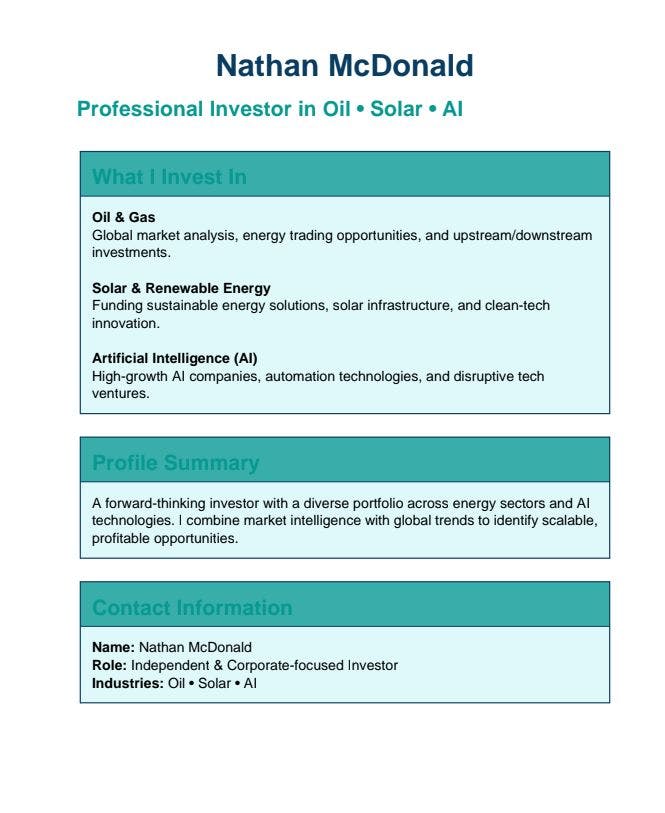 My Name is Nathan McDonald, I'm a diversified energy and technology investor with a focused portfolio spanning oil and gas equities, solar energy systems, and artificial intelligence ventures. With a strategic approach grounded in market analysis, industry research, and long-term value creation, I have built a reputation for identifying high-potential opportunities across traditional and emerging sectors.