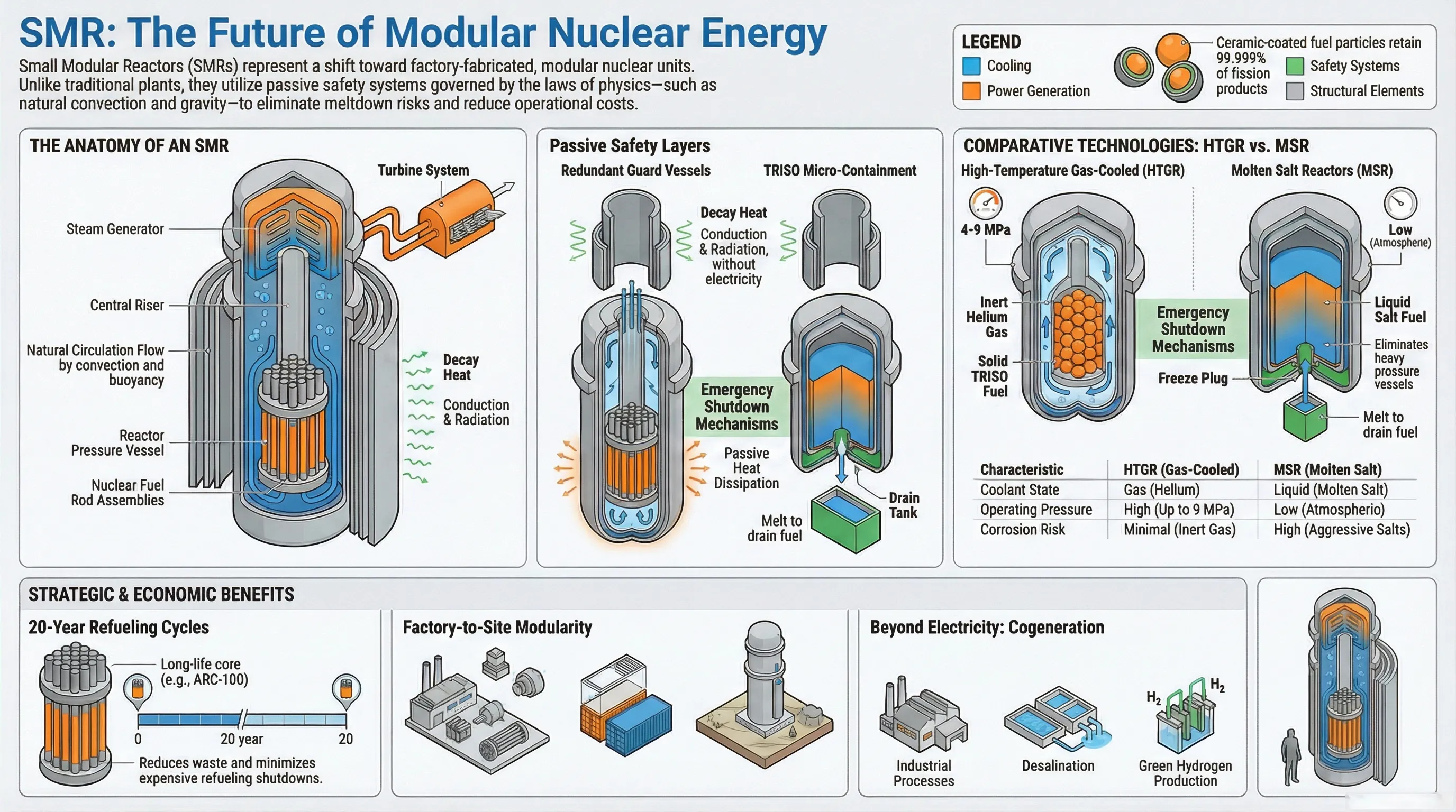 Two leading SMR architectures are emerging as frontrunners: High-Temperature Gas-Cooled Reactors (HTGR) and Molten Salt Reactors (MSR). HTGRs operate at pressures up to 9 MPa using inert helium gas as coolant and solid TRISO fuel, offering minimal corrosion risk and high thermal efficiency. MSRs, by contrast, operate near atmospheric pressure with liquid salt fuel, eliminating the need for heavy pressure vessels — though their aggressive salt chemistry demands advanced materials engineering. Each technology offers distinct tradeoffs, and the right choice will depend on site conditions, grid integration needs, and end-use application.