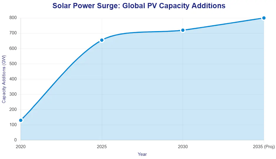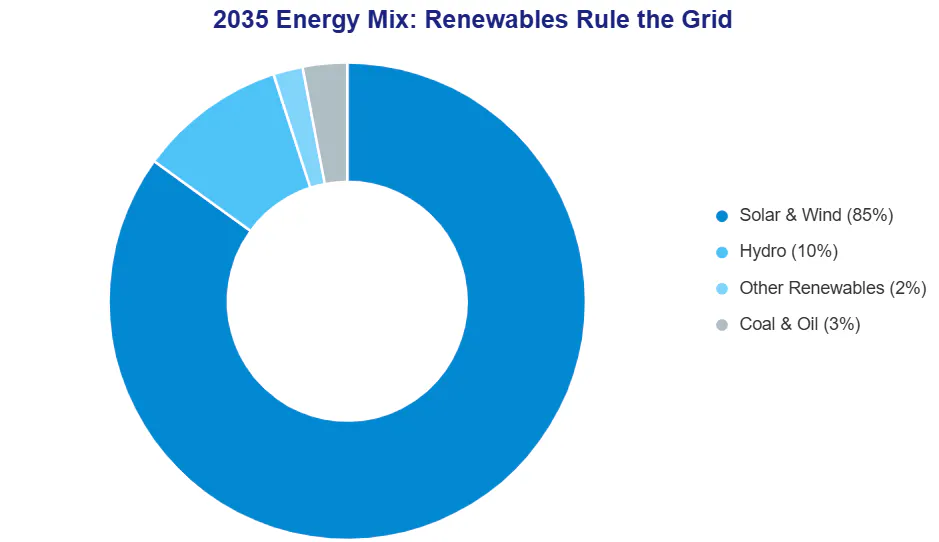 Picture waking up in 2035, where renewable energyâsolar, wind, and hydroâpowers 85% of global electricity, and electric vehicles (EVs) dominate 75% of roads. Oil and coal? Theyâre fading fast, down to 3% of global energy mix, relegated to niche industrial uses. This isnât just a cleaner worldâitâs a smarter, quieter, and more equitable one, transformed by solar panels humming on rooftops, EVs gliding silently, and grids dancing with AI-driven efficiency. As a solar veteran with 15+ years designing GW-scale projects, letâs walk through your day, grounded in 2025 data projections, and uncover the wild, unpredictable shifts and curiosities this future holdsâcomplete with charts to spark your imagination!