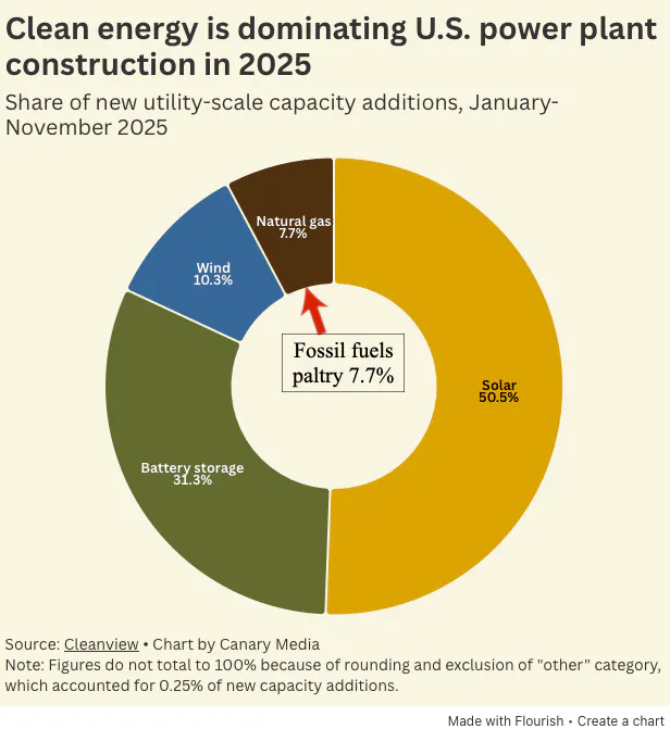 CanaryMedia: “Chart: Clean energy remains dominant in the US — despite Trump.” For those who have assumed the president has successfully squashed renewable energy in this country, this may prove interesting. For all of Trump’s paeans to “beautiful, clean coal” and to natural gas, it’s clean energy that has once again led the way this year. “Through November, 92% of new power capacity [+ storage] added to the grid in 2025 came in the form of solar, wind, or storage, according to Cleanview analysis of U.S. Energy Information Administration data.” Let me emphasize here that over half was solar, + almost one-third battery storage. And that’s in line with figures from recent years…in 2024, 96% of U.S. capacity additions were carbon-free. “Despite Trump’s all-out assault on wind energy—and his pledge that no “windmills” would be built during his term—the energy source has so far accounted for more gigawatts of new electricity than gas turbines have.”