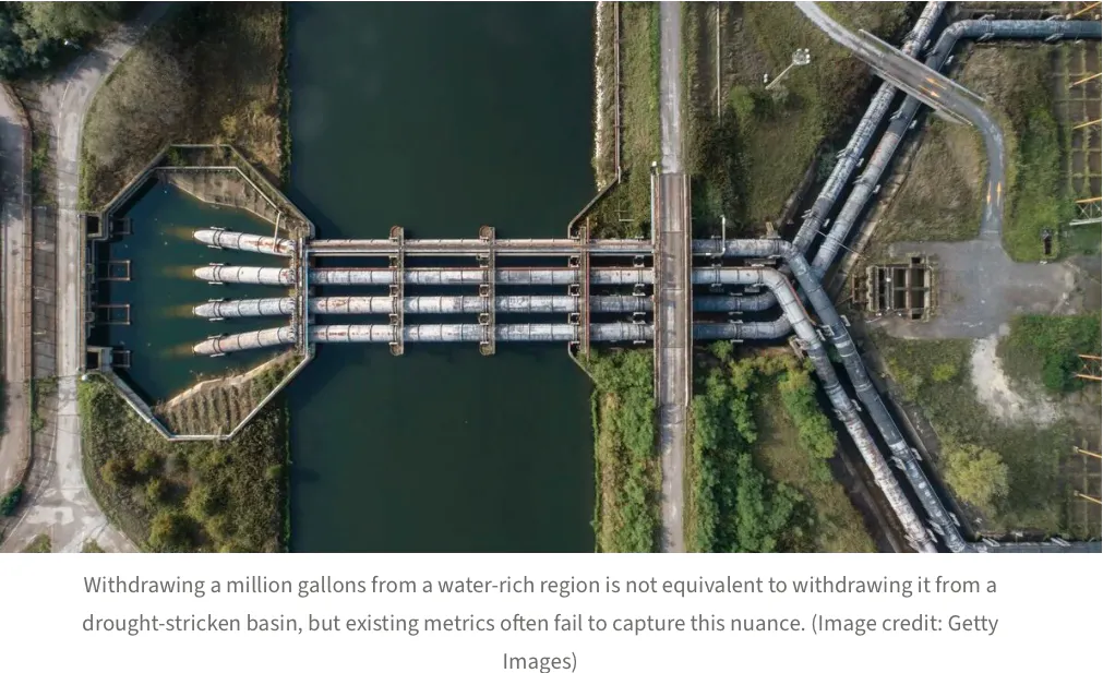 “Thousands of companies around the world now regularly disclose [incomplete] aspects of their water use as part of corporate commitments to environmental, social, and governance goals [ESG.]” Thus, weighting factors were devised based on the level of stress of the local watershed. “Analyzing data from the London Stock Exchange Group…[researchers] found that while 14% of major companies reported their greenhouse gas emissions, only 9% provided explicit data on total water withdrawals…more tellingly, only 1% disclosed whether their operations utilized recycled water.”