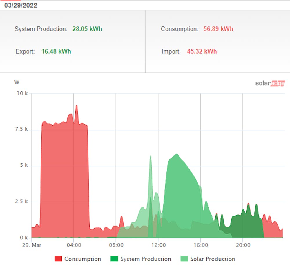 In the winter months, consumption exceeds production. Anytime I charge the Model 3, consumption shoots up, as can be seen in the graph for March 29, 2022.
