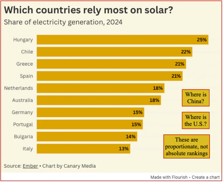 CanaryMedia: “Chart: Hungary is leading the world in solar adoption.” Initially a surprise, nowhere in the chart do you see China, tropical countries or the U.S., until you check + see that this bar chart represents proportionate shares of generation, not absolute quantities. “The global leader is Hungary, according to a recent report from think tank Ember that pulls from full-year 2024 data and only considers nations that generated over 5 terawatt-hours of solar.” This Central European country got nearly one-quarter of its electricity from solar panels last year, leapfrogging Chile, which had held the top spot since 2021. “Just five years ago, Hungary got only 7% of its power from solar…Ember attributes the rapid growth to robust policies supporting both utility-scale + residential installations.”