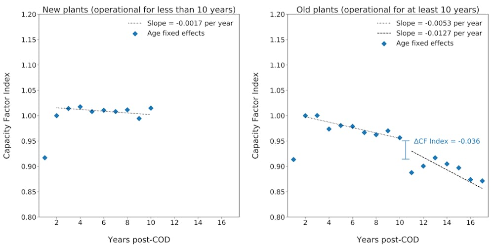 Average decline in performance with age for two cohorts of plants. COD stands for commercial online date. The y-axis can be interpreted as a ratio of performance to year 2, so, for example, a value of 0.95 indicates that a plant produced 95% of the energy in a particular year compared to year 2 of life (after weather correction).