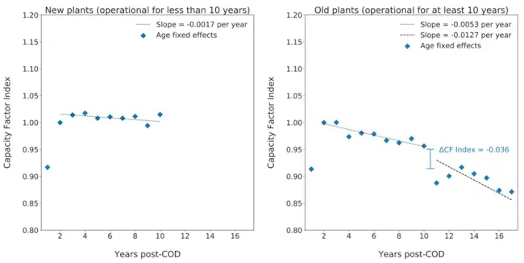 The performance of wind plants may decline over time due to a number of reasons, such as increasing downtime for maintenance, erosion of blade edges, or increased friction within rotating components. It is also possible for performance to improve if software, or even hardware, updates are installed. However, in most cases plant performance tends to decline slightly with age.