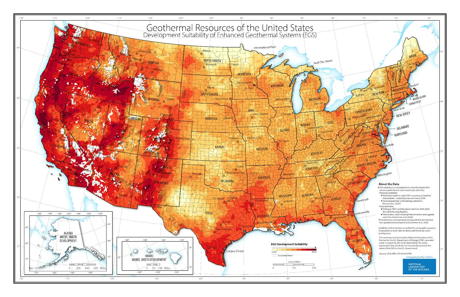 NREL just released a new “heat-beneath-your-feet” cheat sheet designed to help geothermal developers stop guessing and start drilling. The deep crimson marks prime development zones for Enhanced Geothermal Systems (EGS), and boy does it seem like the West is ready to let off some steam.