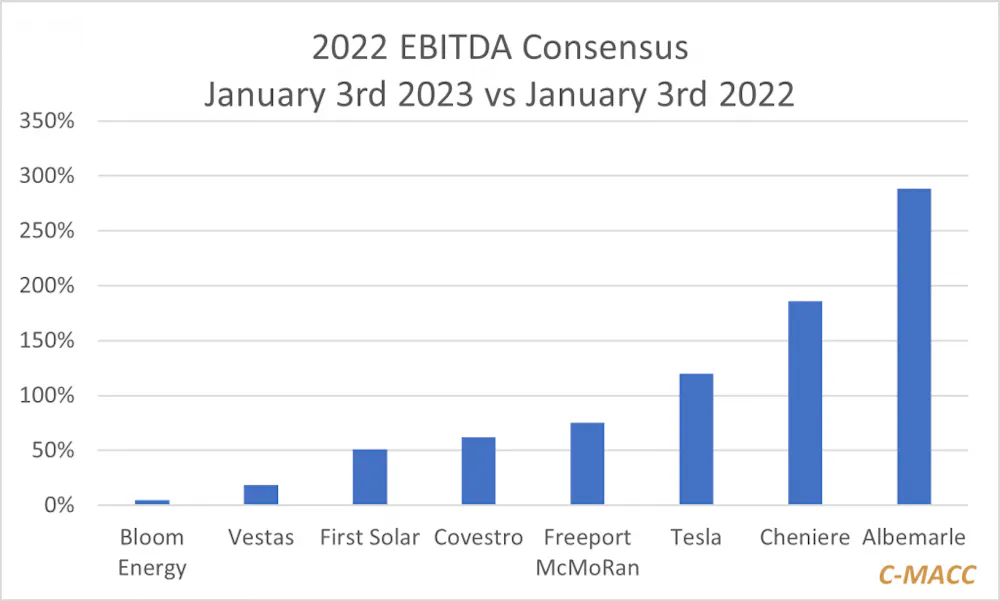 In the chart above, we have excluded several smaller companies that were already expected to lose money in 2022 and where estimates have got worse. It is perhaps a little unfair to include Bloom in the chart above as when you are dealing with early-stage companies the numbers are small and percentage changes can be very high. Bloom’s revenue estimate is also down, which explains the earnings revision. Vestas’ revenues have fallen enough to explain most of the earnings revision, but this is not the case for First Solar where cost increases have squeezed margins in 2022. The larger problem for Vestas has been delays. Both cost increases and delays are likely to challenge the renewable power industry in 2023, with governments likely more focused on delays, while companies like Covestro and other German companies very levered to energy prices will be equally focused on costs. For the industrial base in Europe, it is not only about getting adequate power, but also about how that power cost will impact costs versus the competition. Future offshore wind to hydrogen projects in Europe may get delayed or canceled if the ones that are already on the books see construction delays and cost inflation.