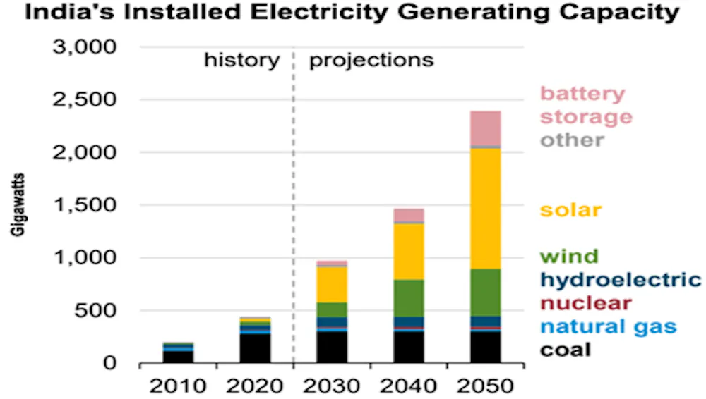 The polysilicon price drop shown in the chart below contrasts with the inflationary environment that we expect for renewable power in 2023 and as discussed above. While China has been adding substantial capacity for polysilicon, it is possible that we have seen the product caught up in the same inventory build and collapse that has been witnessed in other commodities over 2022. We note that some PV makers have reduced prices in China, and this will help ease some of the inflationary fears, but we would not be surprised to see the price trend in the chart below reverse as demand picks up this year, especially if China tries to kick start the economy with a boost to renewable power spending. When we look at charts like the one on India below, we struggle with the idea that raw materials and components will be in surplus at any point over the next 10-15 years, except for very brief periods.